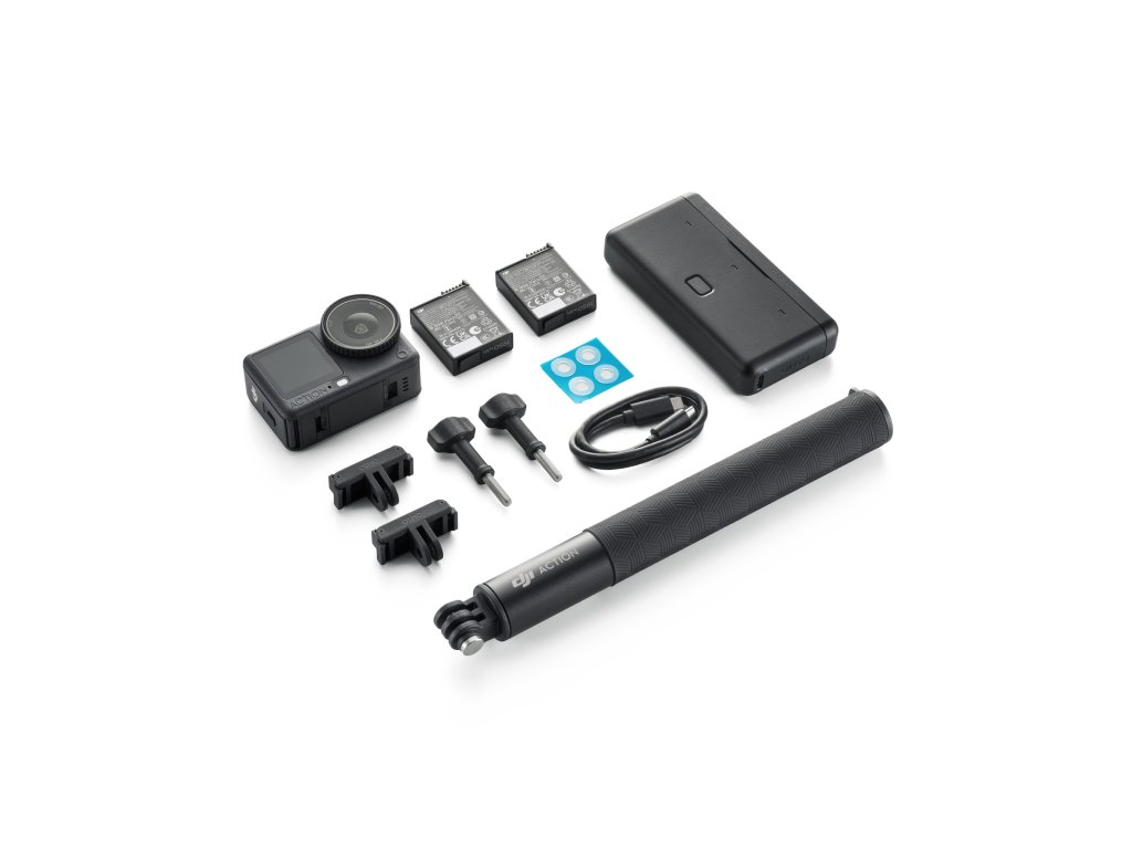 В комплекта DJI Osmo Action 6 Adventure Combo ще намериш пълен набор аксесоари, с които можеш да започнеш да снимаш практически веднага – от камерата и батериите до телескопичния стик и зарядния калъф.